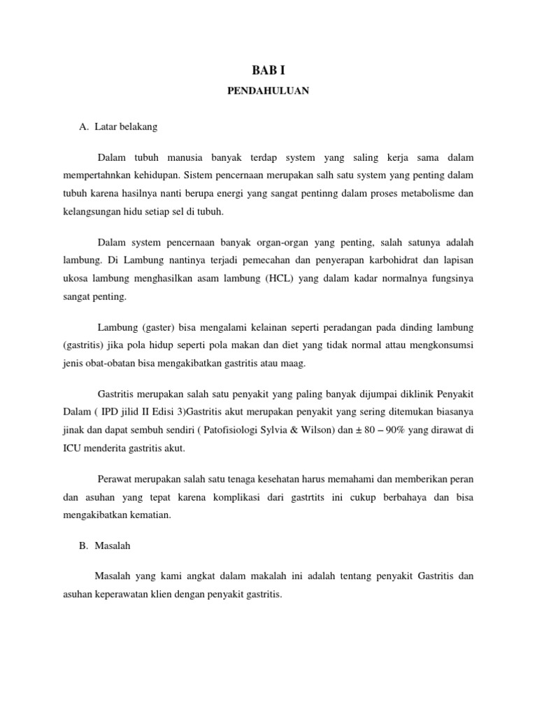 Omni Hospitals Articles from initu.id Gangguan kebutuhan rasa nyaman pada pasien gastritis 2. Penyakit berikutnya disebut dengan gastritis yang merupakan peradangan yang terjadi pada dinding lambung. Gastritis atrofikans merupakan penyebab tersering terjadinya hipo atau aklorhidia. Gastritis merupakan panyakit karena gangguan ?. Selain dapat menyebabkan rasa tidak enak, juga menyebabkan peredaran saluran cerna atas, ulkus, anemia kerena gangguan absorbsi vitamin b12. We did not find results for: Check spelling or type a new query. Penyakit ini bisa cukup berbahaya karena dapat terjadi dalam jangka waktu yang lama dan merupakan penyakit akut yang sulit untuk disembuhkan.